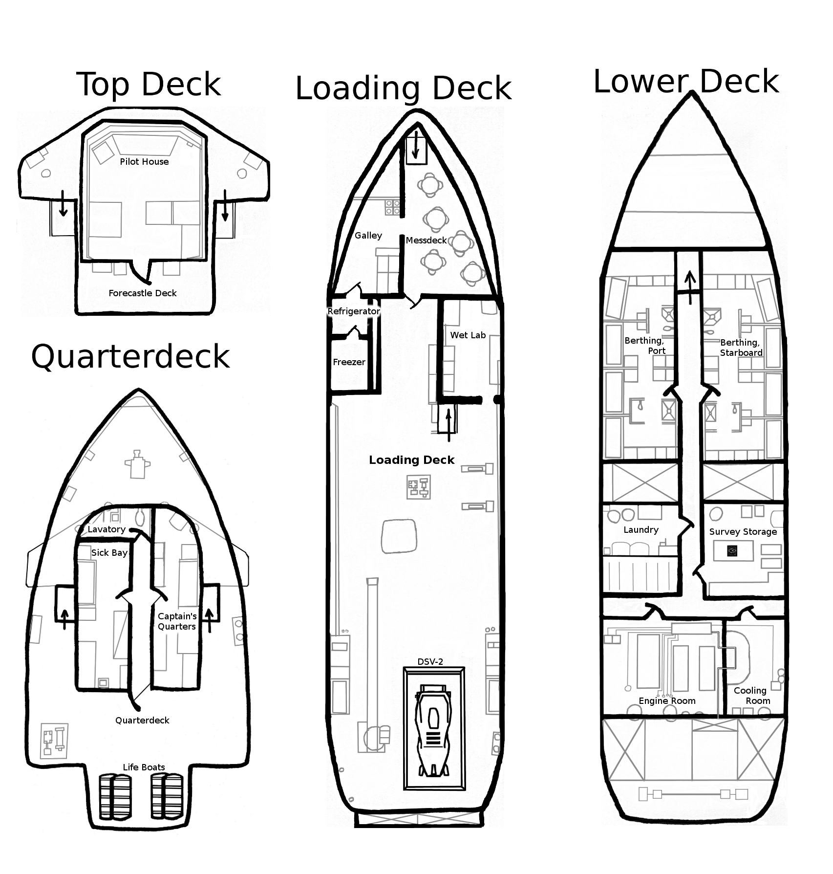 Based on real research vessels, the map was designed to feel grounded even with clear room-delineations, while also accommodating structural level design needs.