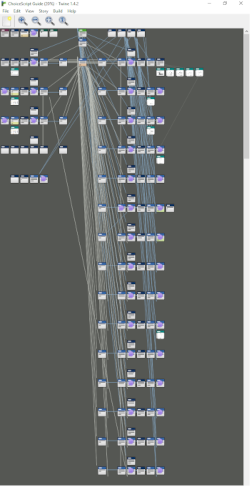 While many ChoiceScript guides existed, they were mostly written in ChoiceScript itself, which made stepping back to visualize the nuts and bolts of the mechanics more difficult, and made navigation a little clunky. This guide was written in Twine, which offered more tools to explain complicated mechanics.
